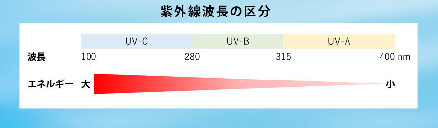 紫外線(ultraviolet radiation : UV)とは、可視光よりも短い波長をもつ目には見えない光です。物体にエネルギーを与えて様々な作用をもたらします。100〜400nm:1ナノメートル:1mの10億分の1)の範囲を国際照明委員会では以下のように区分しています。