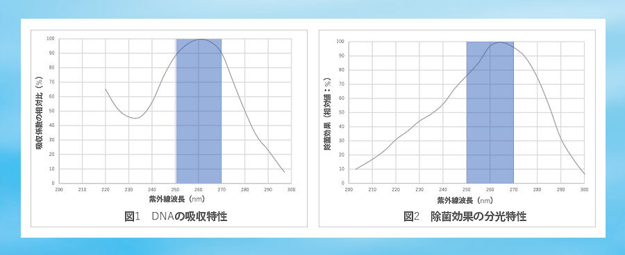 DNAの吸収特性と除菌効果の分光特性が近似していることから、DNAに作用し化学反応を引き起こす説が有力で、UV-Cの260nm付近の効果が最も高いとされています(図1、図2)。