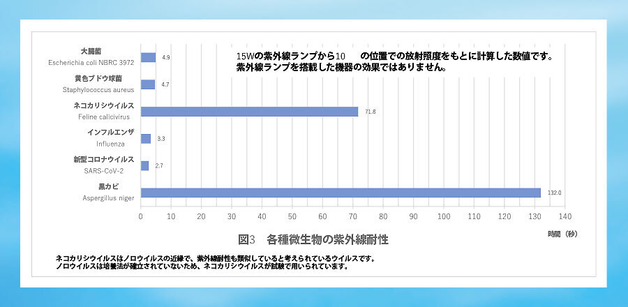 紫外線の作用は細菌やウイルスを含む微生物に有効ですが、効果の度合いはそれぞれ著しく異なります。例として、代表的な微生物の253.7nmの紫外線に対する耐性を以下に示します。